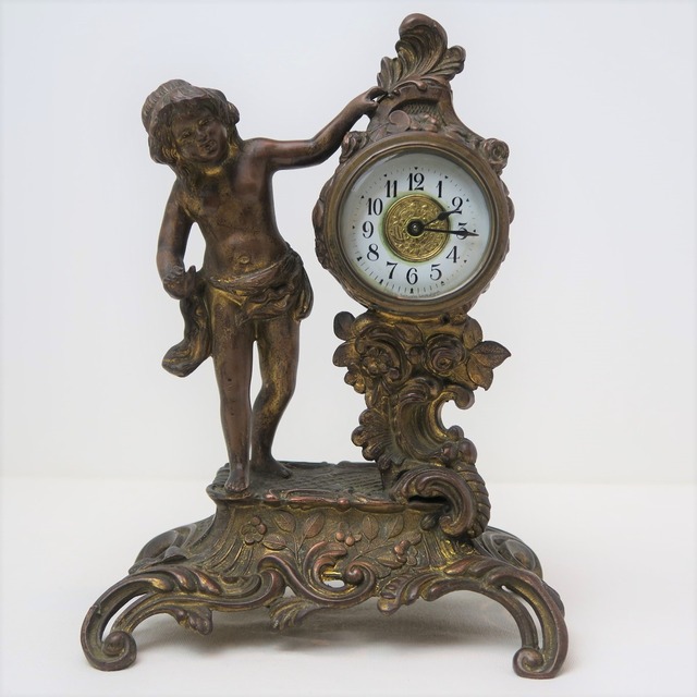 精工舎 ブロンズ置時計 少年の像 とても古い機械式時計で、大正~昭和初期のモノです。 ブロンズの状態も良く、時計のメカは注油してメンテナンスしておりますので動作も問題ございません。 動作はゼンマイ式で1日巻きとなります。 ブロンズ像と時計の形状は、とても凝った細工となっており、 細かく眺めていると当時の美的センスが時代を超えて伝わってきます。 サイズ:15.5x22x9㎝ 重量:1.2㎏ なお、時間の精度については、ある程度合わせておりますが、 必要な微調整はお客様にてお願いします。 (背面の小さなノブで調整可能) ※この商品につきましては、ご購入後1か月の間に不具合などあった場合は 修理または返金対応をさせて頂きますのでご安心してご購入下さい。 (ゼンマイの破損を除く)